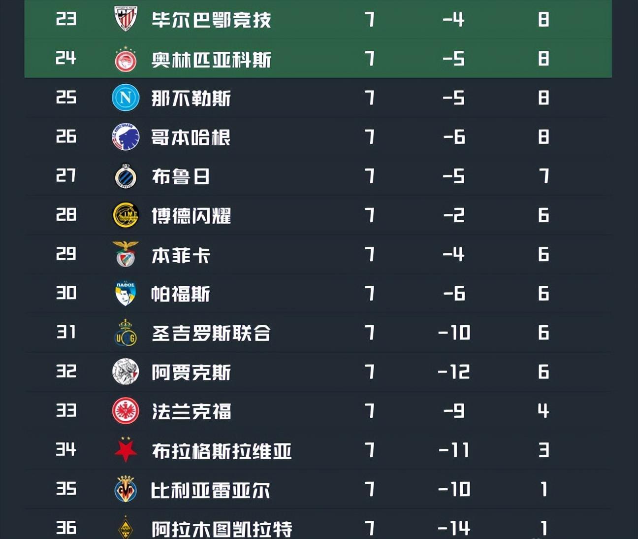 北京时间1月22日,25/26赛季欧冠联赛阶段第7轮的比赛已经全部结束,积分榜的形势也产生了进一步的变化。阿森纳和拜仁齐齐提前出线,榜尾的4支球队也提前出局;而在晋级区和附加赛区域更是一片混乱,不管是巴萨,国米,切尔西,曼城等豪门都有踢附加赛的危险。